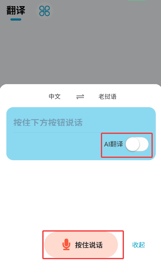 3、语音翻译实时高效:按住麦克风图标说话,实时将语音转换为文字并进行翻译,支持方言识别功能。