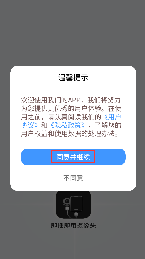 1、首次启动APP会弹出用户协议,点击"同意"后即可进入设备管理主界面。