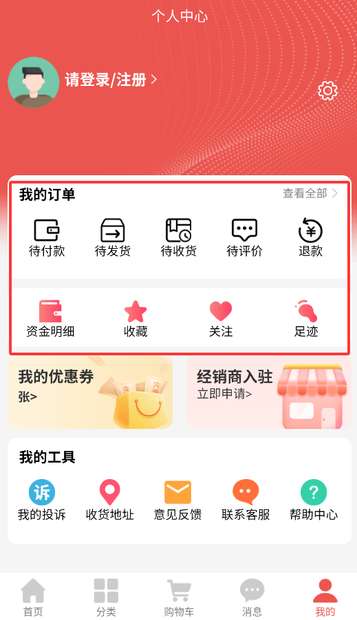 4、个人中心集成订单管理、资金流水查询、收藏夹、关注店铺及浏览历史等实用功能。