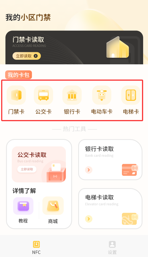 1、打开APP后进入"NFC卡包"功能,这里整合了门禁卡、交通卡、支付卡等各类电子卡片管理服务。