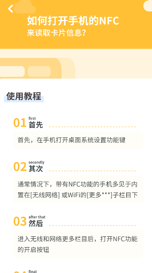 3、若遇到操作问题,APP内提供详细的NFC功能开启教程,包含不同手机品牌的NFC设置步骤图示说明。