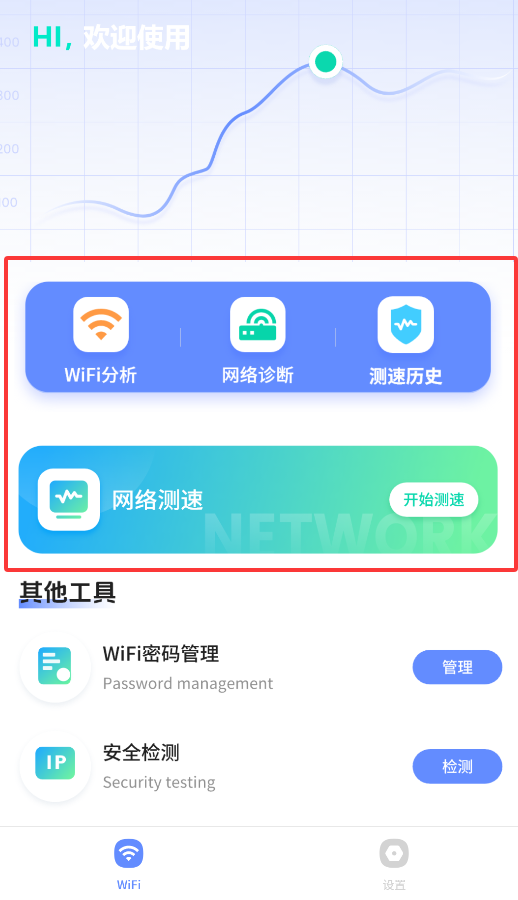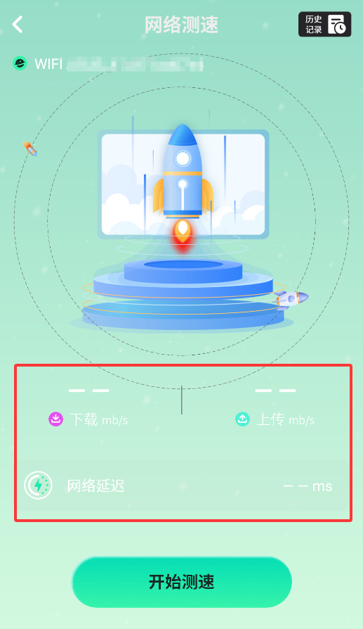 3、"网络测速"功能实时显示当前WiFi的下载/上传速率及网络延迟数据,评估网络质量。