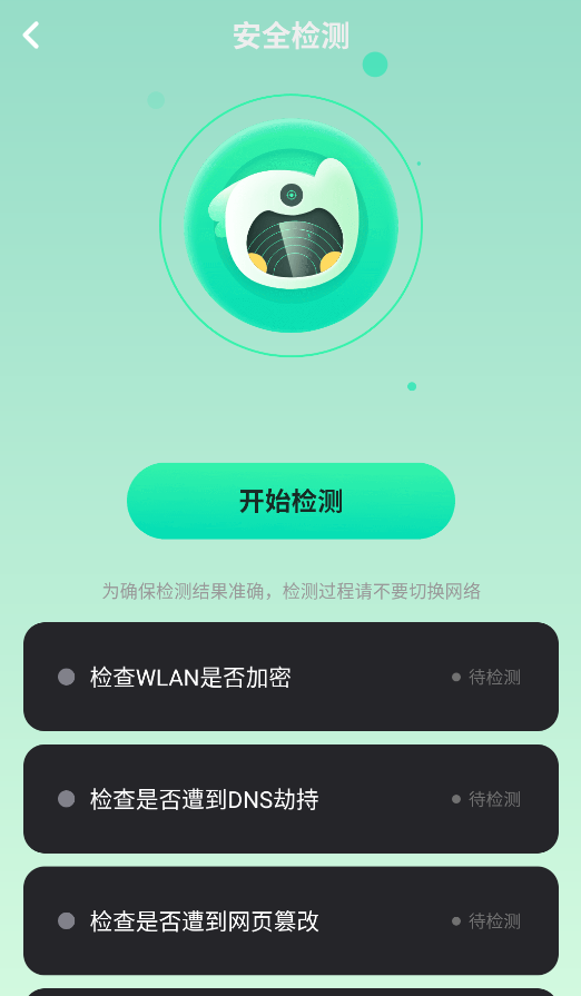 4、"安全检测"可全面检查WiFi加密状态、DNS劫持风险及网页篡改等安全隐患。
