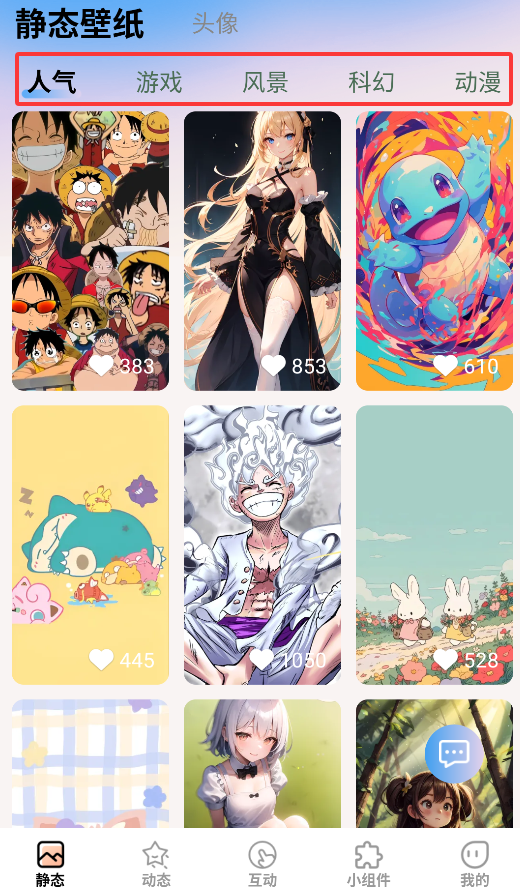 3、互动壁纸专区体验独特:特别设置互动体验区,包含触控反馈、重力感应等创意壁纸,带来全新交互体验感受。