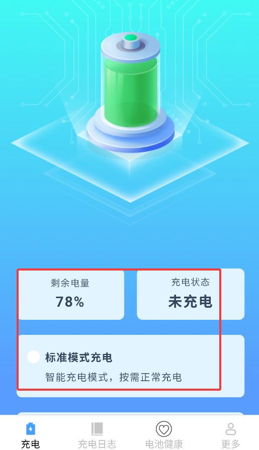 2、充电监控页面实时显示剩余电量百分比、当前充电状态,并支持一键启用智能标准充电模式。
