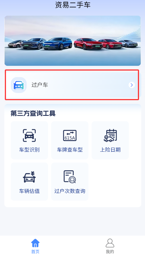 2、首页提供"过户车查询"功能,点击即可开始车辆信息检索。