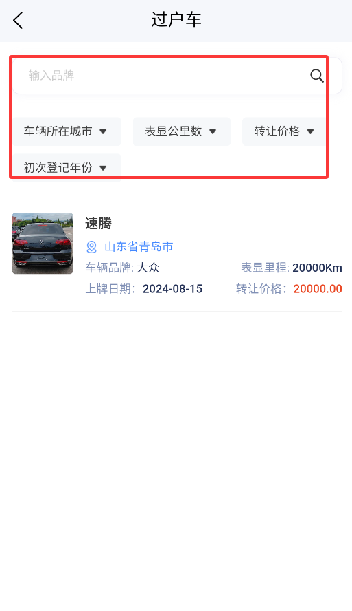 1、用户可在查询页面输入车辆所在城市、表显里程、价格区间等条件,筛选符合条件的过户车辆信息。