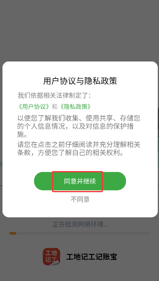 1、首次启动工地记工记账宝APP时,系统会弹出用户协议窗口,点击"同意"按钮后即可进入主界面。