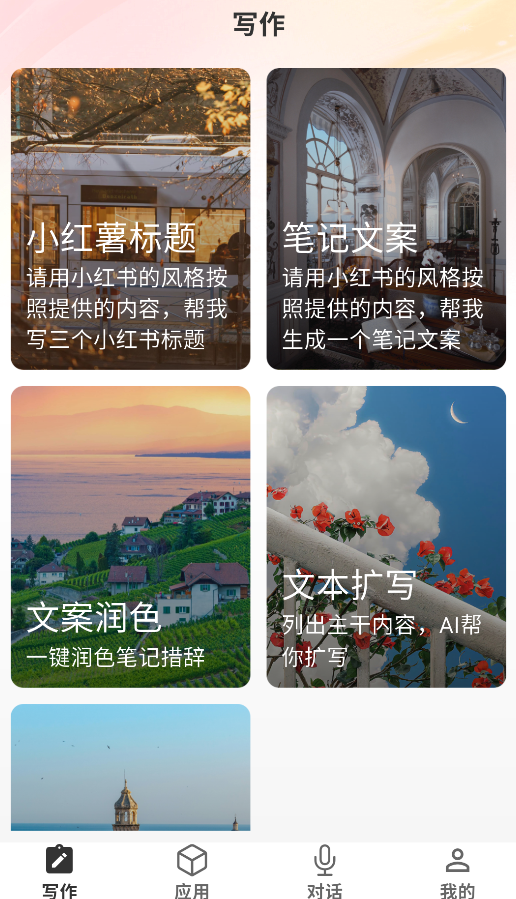 1、打开APP后,在创作界面可选择多种文案生成功能,包括小红书标题创作、笔记文案优化、文本润色和内容扩写等实用工具。