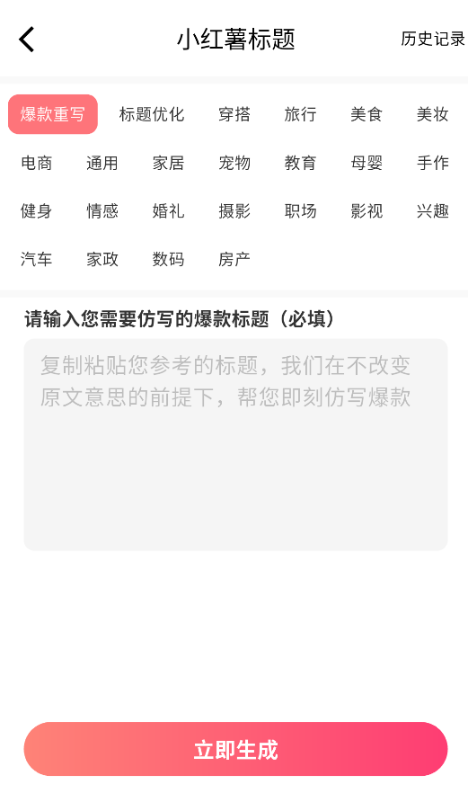 2、以标题生成为例,先选择标题风格类型,输入参考内容后点击"一键生成"即可获得多个创意标题建议。