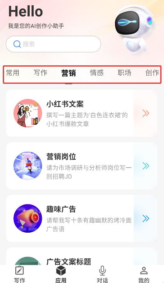 3、应用提供多场景创作支持,涵盖营销文案、情感故事、职场写作等专业领域的智能辅助创作。