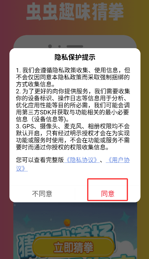 1、首次启动APP时会显示隐私保护声明,点击"同意"按钮后即可正常使用各项功能。