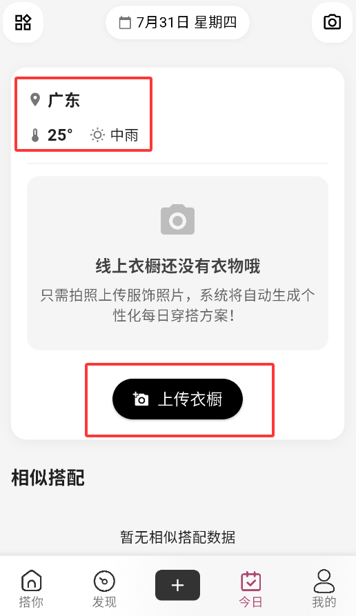 4、"今日推荐"结合当地天气推送适配服装,支持上传衣橱照片智能匹配已有单品。