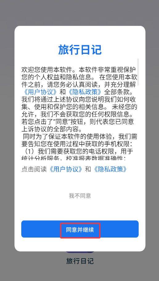 1、首次启动APP会弹出用户协议,点击"同意"后即可进入旅行记录平台主界面。