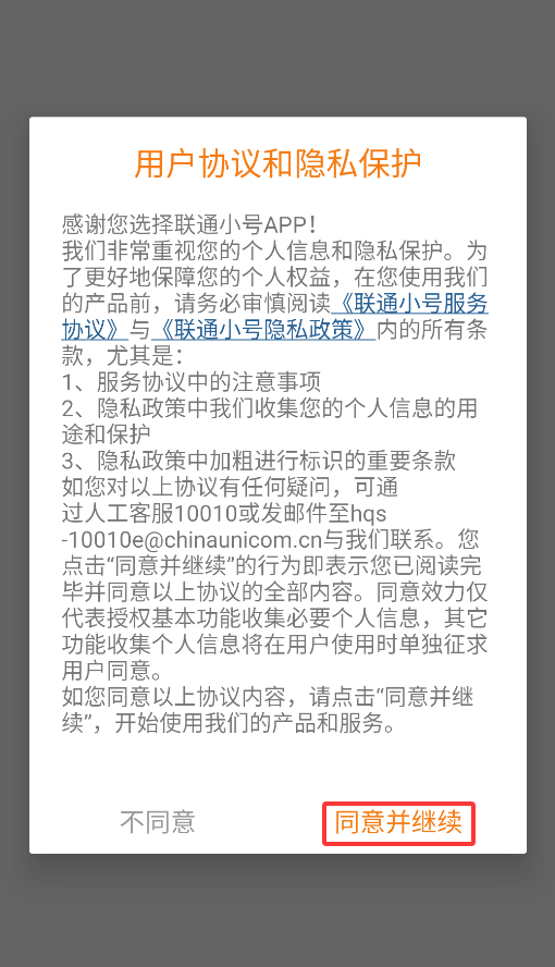 1、首次启动APP会弹出用户协议,点击"同意"后即可进入虚拟号码管理平台。