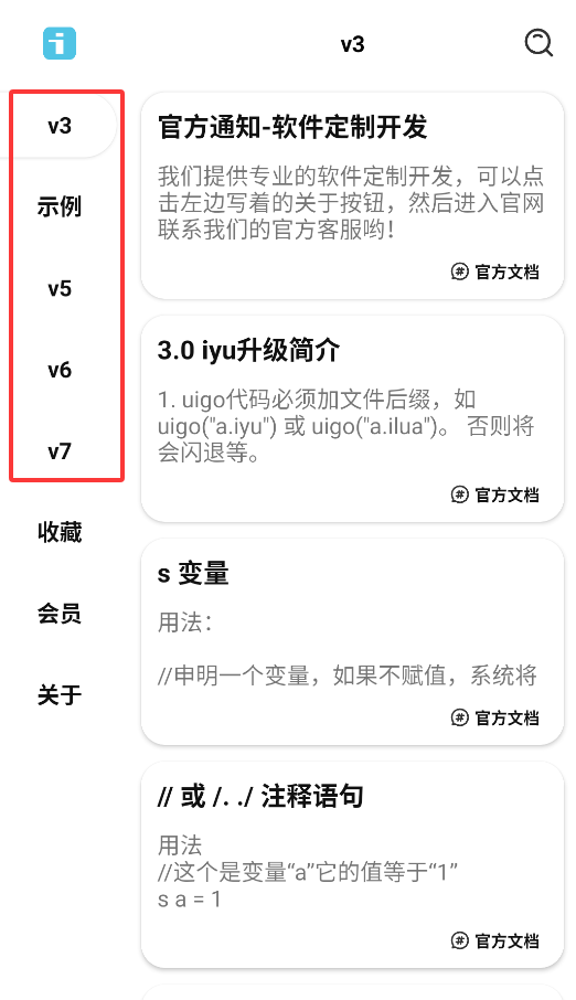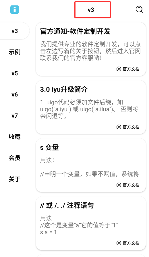 2、左侧导航栏提供版本筛选功能,可快速定位V3、V5、V6、V7等不同版本的程序代码示例。