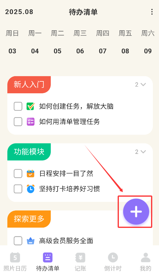3、进入待办事项功能后,点击右下角的"+"按钮就能新建任务清单,支持设置提醒时间和优先级。