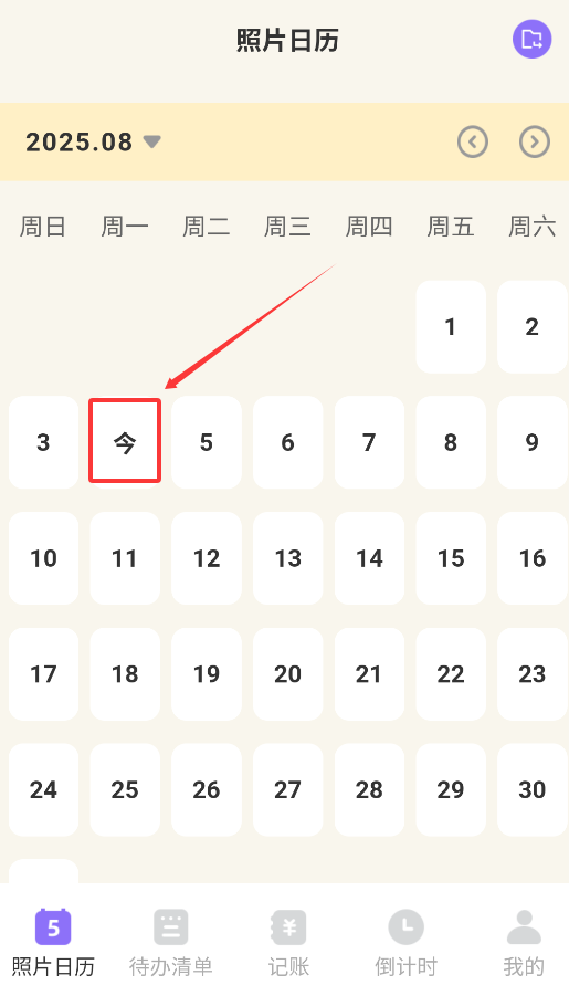 2、在照片日历页面,直接点击当天日期即可快速添加照片或文字笔记,自动按日期分类保存。