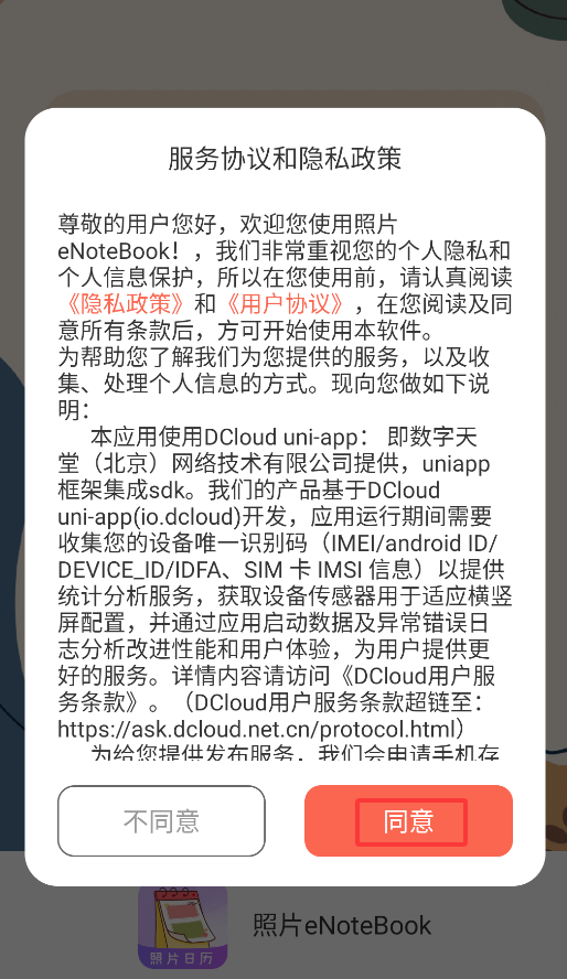 1、首次启动照片eNoteBook时,系统会弹出用户协议窗口,点击"同意"后方可进入应用主界面开始使用。