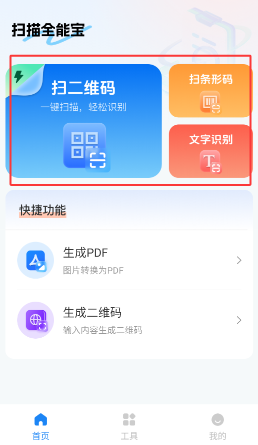 1、打开APP后,主界面提供三大核心功能:二维码扫描、条形码识别和图片文字提取,满足日常多种识别需求。
