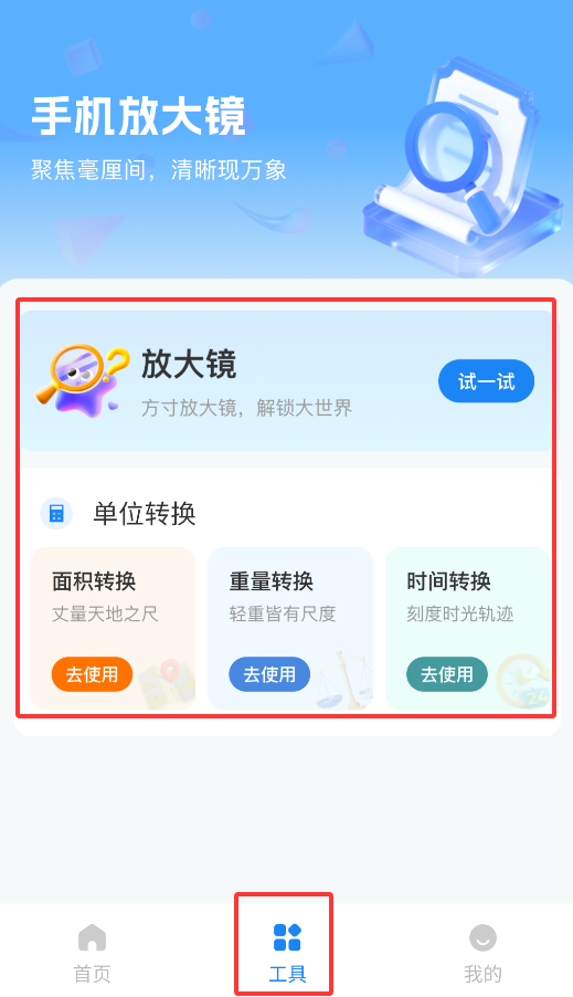 4、"实用工具"板块集成多种便捷功能,包括放大镜、单位换算(面积/重量/时间)等生活小工具。
