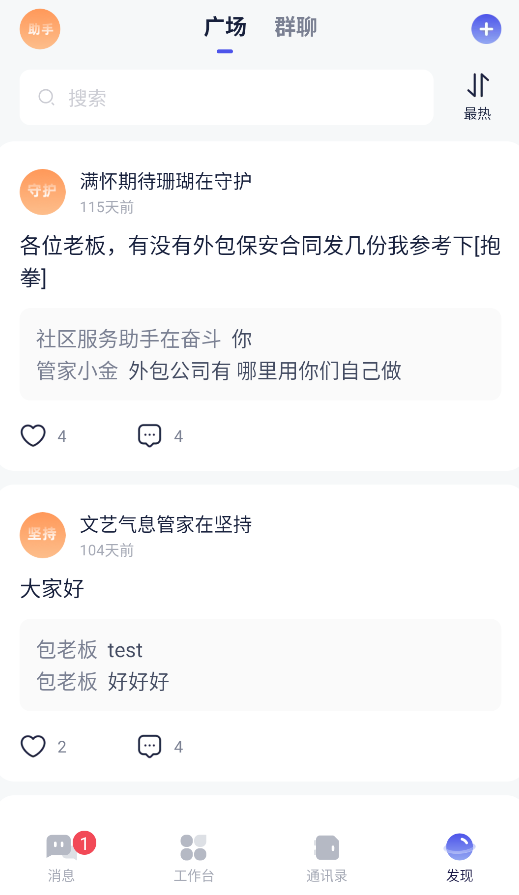里享服务这个物业办公APP真心方便!专为小区管理人员设计,把那些麻烦事儿都变简单了。同事之间随时能联系,有啥问题群里一说立马解决。最智能的是里边的AI问答,工作遇到难题随时问,秒回解答。物业工作的朋友用这个,保管让你上班轻松不少,赶紧下载试试吧!