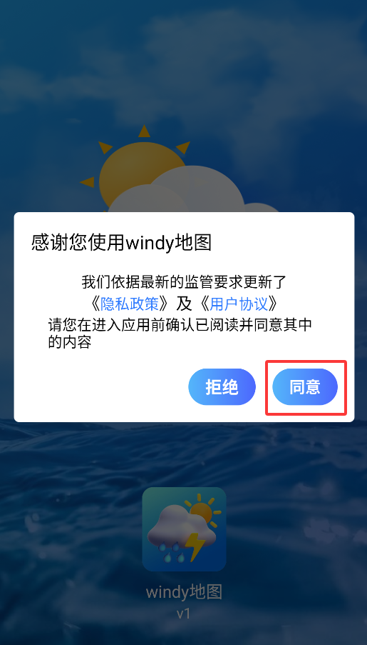 1、首次启动APP会弹出用户协议,点击"同意"后即可进入气象地图主界面。