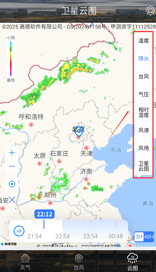 4、专业云图模式支持叠加显示温度、降水、气压、风速等多维度气象图层,满足专业分析需求。