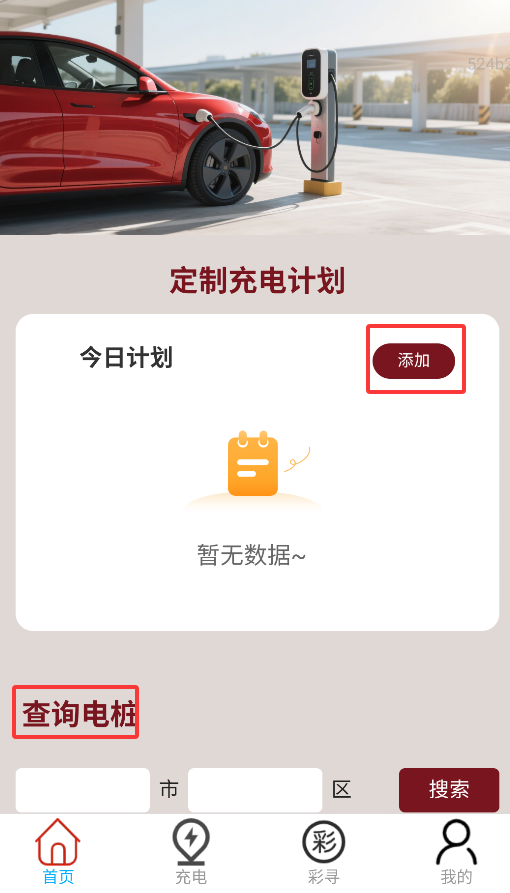 2、首页提供充电计划管理和附近充电桩查询功能,点击"添加"可创建个性化充电方案。