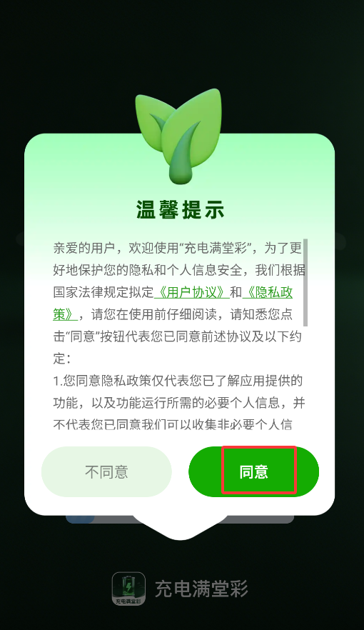1、首次启动充电满堂彩APP时,系统会弹出用户协议确认窗口,点击"同意"按钮后方可进入应用主界面。