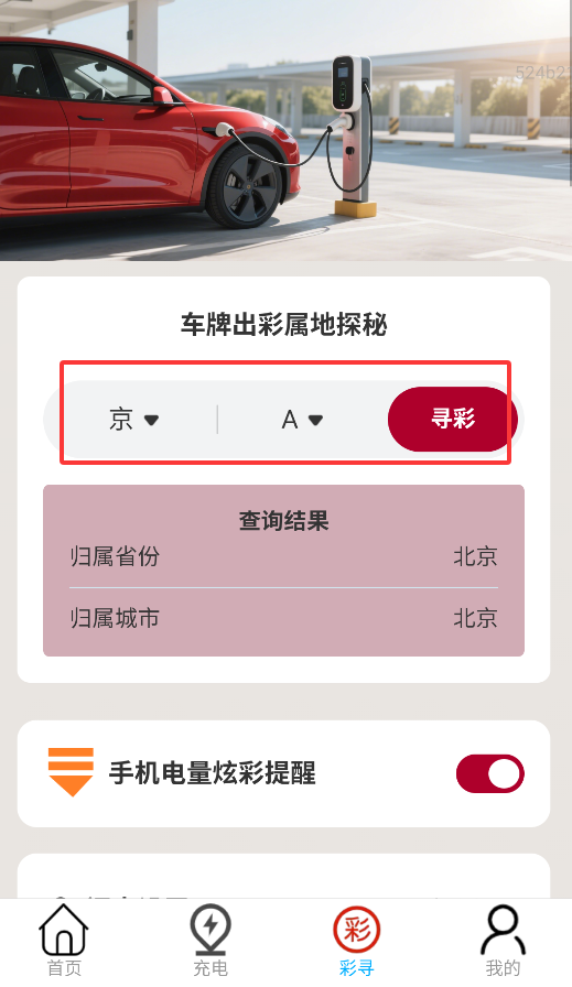 4、趣味彩蛋功能包含车牌属地查询和手机电量炫彩提醒,输入车牌号点击"寻彩"即可查看专属彩蛋内容。
