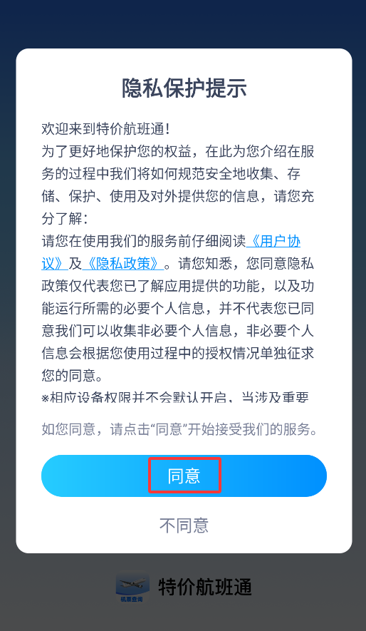 1、首次启动程序会显示用户协议窗口,点击确认后进入机票查询平台。