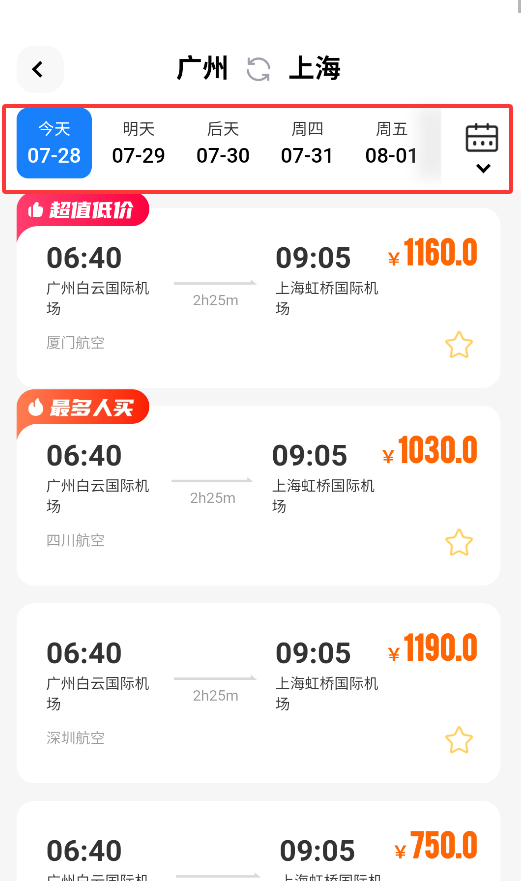 3、日期选择界面会标注特惠航班和热门时段,方便比价选购。
