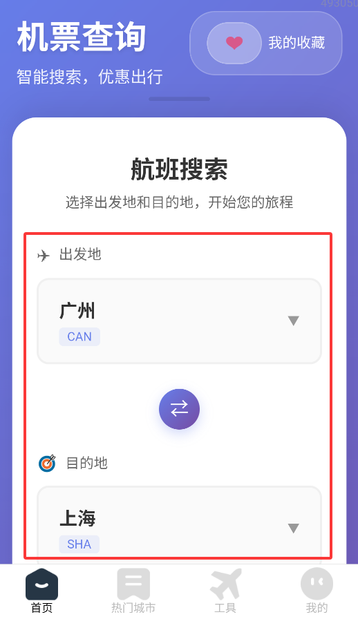 1、应用首页输入出发地和目的地信息,系统立即显示实时票价对比数据和智能推荐航班出行方案。