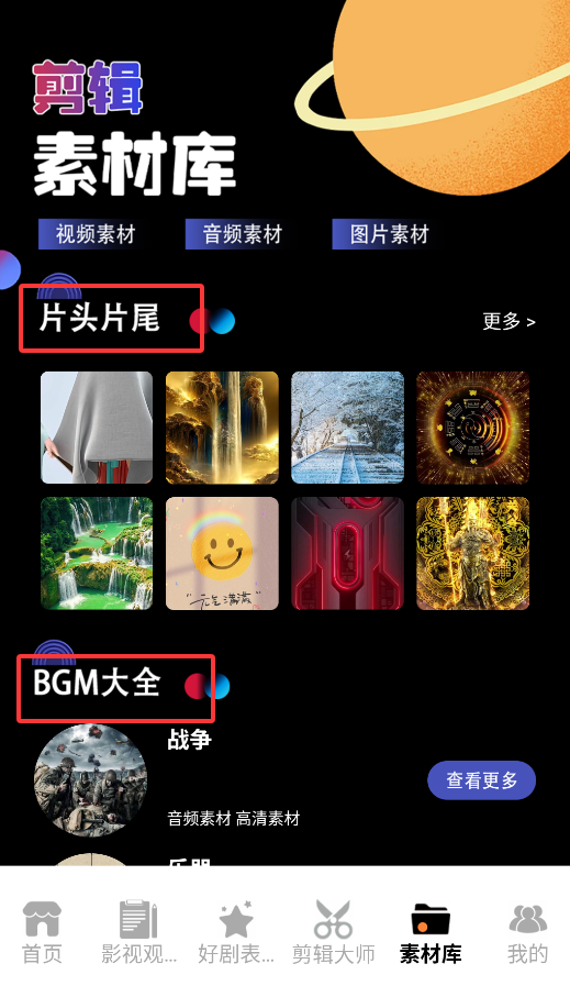 4、素材库分类管理海量资源,包含专业片头片尾模板、背景音乐库和高清图片素材,支持关键词搜索快速定位。