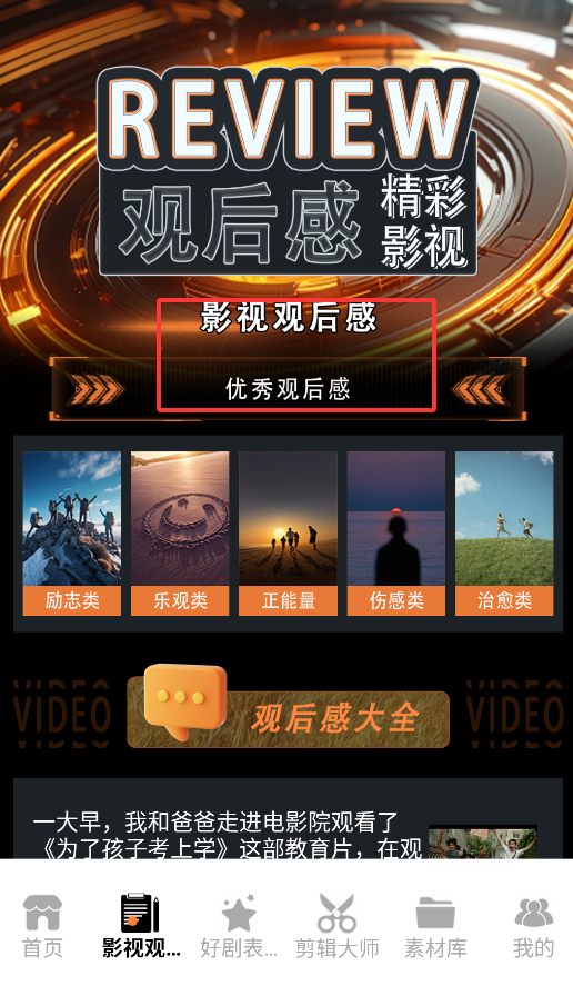 3、"观后感文库"汇集各类影视作品的深度解析和观众评论,为创作提供灵感参考。