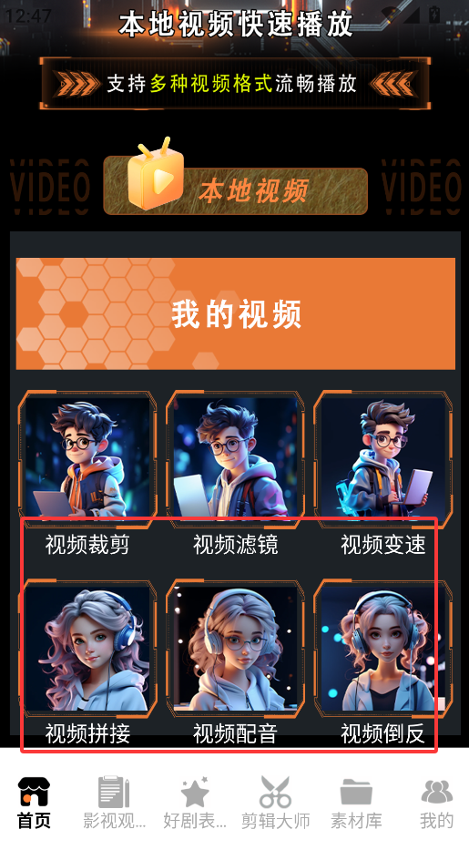 1、打开APP后,首页提供六大视频编辑功能:时长裁剪、风格滤镜、速度调节、片段拼接、配音录制和画面反转等专业工具。