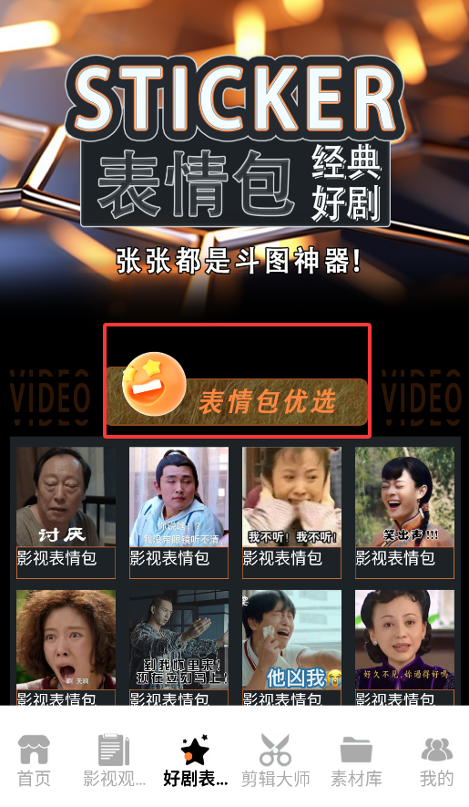 2、进入"影视素材"专区,可获取热门剧集的经典表情包资源,支持一键添加到视频中。