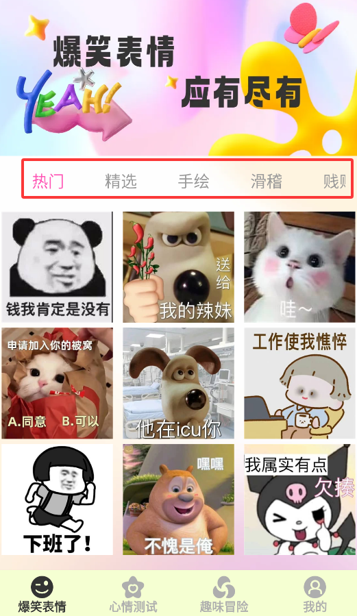 2、"爆笑表情"专区提供多种分类表情包,包含热门推荐、精选合集、手绘创作和滑稽搞笑等主题。