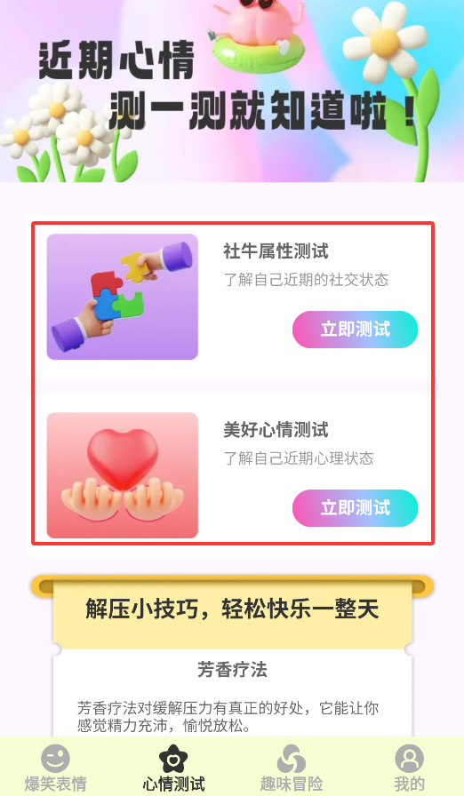 3、"心情测试"功能可进行社交性格分析,包含社牛指数评估和情绪状态检测等趣味测试。