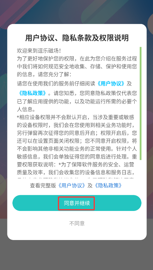 1、首次启动APP时会显示用户协议,点击"同意"按钮后即可进入逗乐磁场主界面。