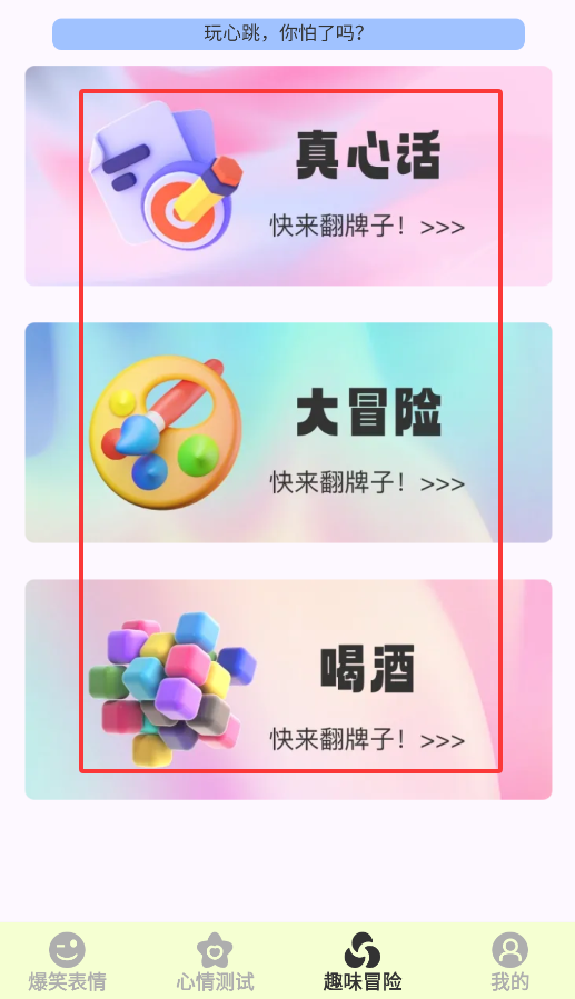4、娱乐集合:整合真心话大冒险、翻牌游戏等多人互动玩法,适配朋友聚会、线上社交等多种场景。