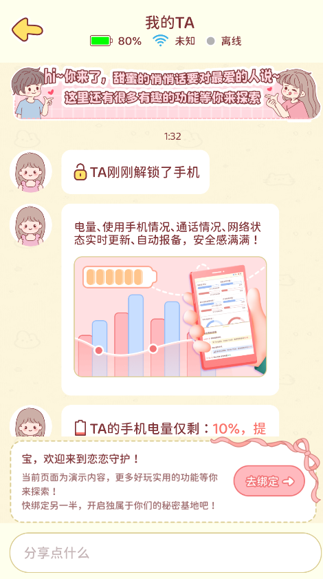 2、通过私密聊天发送实时消息,系统会智能同步对方的手机状态(如电量、位置),自动生成贴心提醒。