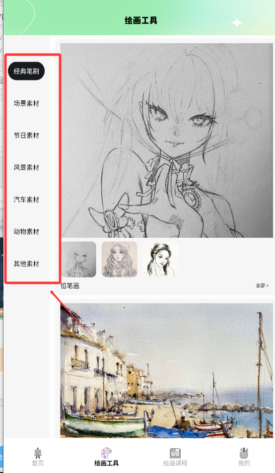 3、素材库按风格题材细致划分,包含线稿色彩笔刷等多样化资源,为创作提供高效便捷的灵感支持与工具辅助。