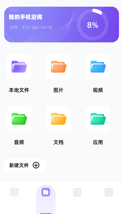 2、进入文档管理界面,可以查看手机存储空间使用情况,并分类浏览本地文件,包括图片、视频、音频、文档及已安装应用。