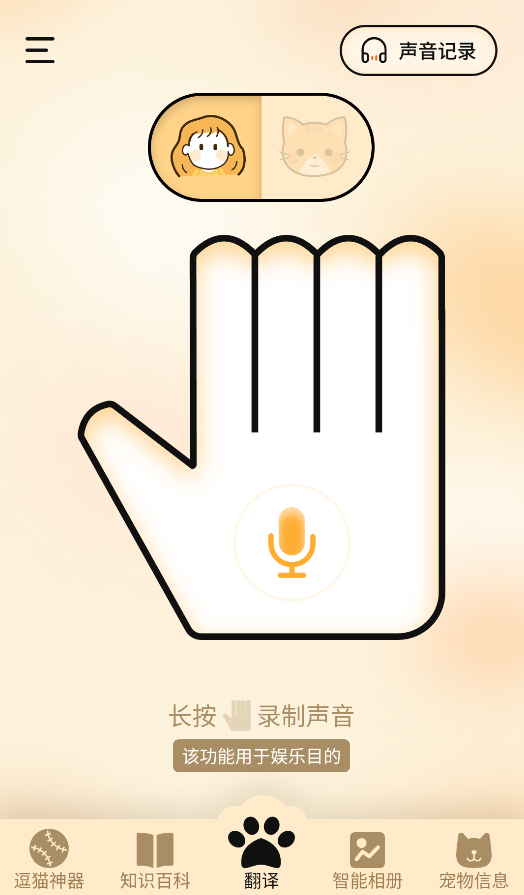 1、启动APP后,在“猫语翻译”界面长按录音,系统会将你的话转换成猫咪听觉频率的声音(娱乐功能,非真实翻译)。