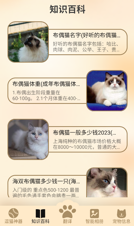 3、通过“养猫百科”查询品种标准(如布偶猫成年体重4-9kg)、取名灵感或护理技巧,支持收藏干货文章。