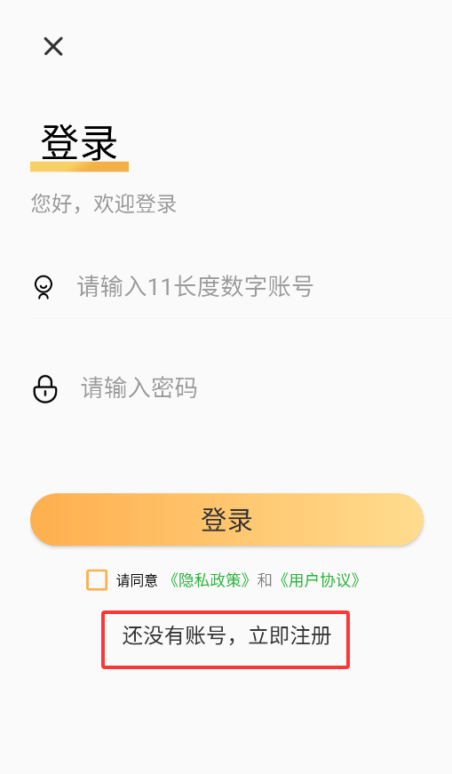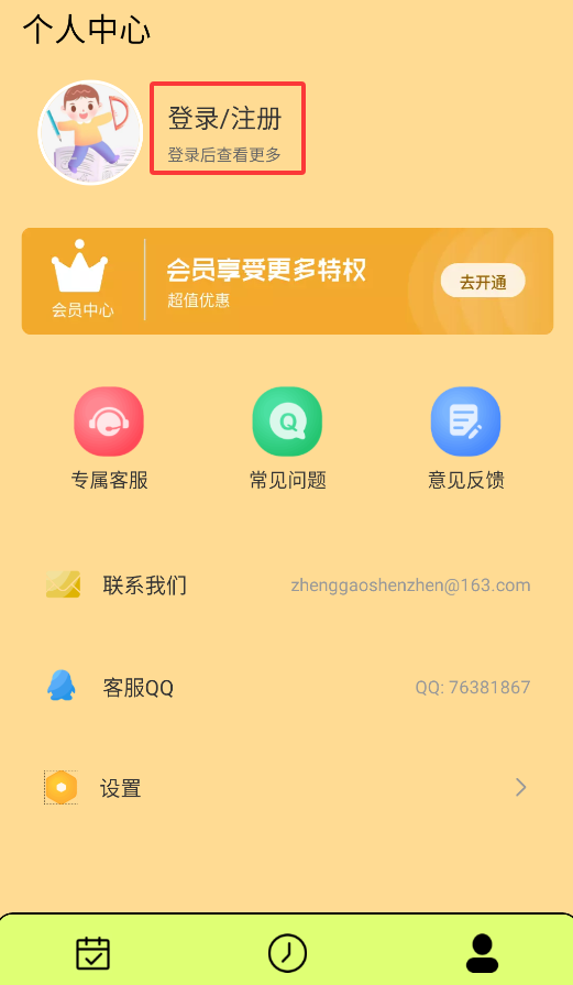 1、启动APP后,进入“个人中心”,点击“注册/登录”按钮进入账号管理页面。