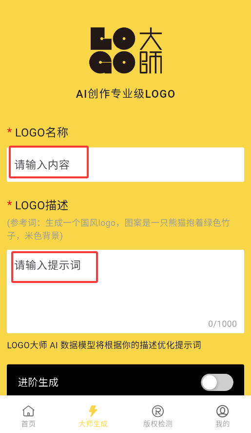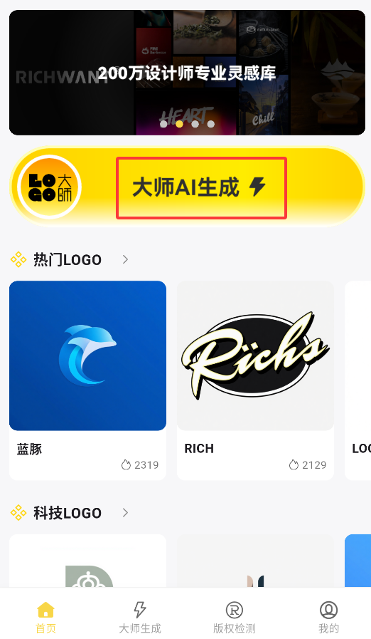 1、启动APP后,点击首页"AI生成"按钮,进入智能LOGO设计界面。