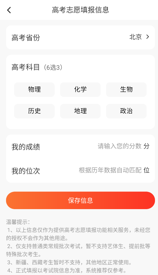 2、按要求填写所在省份、考试科目、高考分数及全省排名等关键信息。